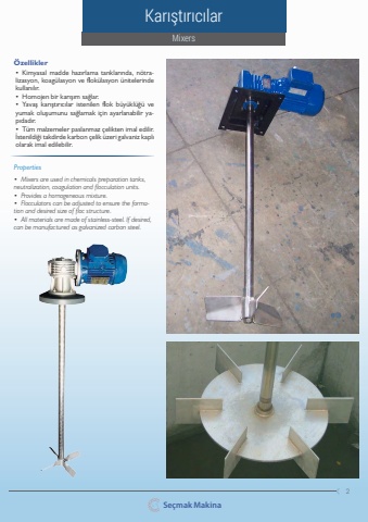 Se%u00e7mak Makina2MixersKar%u0131%u015ft%u0131r%u0131c%u0131lar%u00d6zellikler%u2022%u2002Kimyasal madde haz%u0131rlama tanklar%u0131nda, n%u00f6tralizasyon, koag%u00fclasyon ve flok%u00fclasyon %u00fcnitelerinde kullan%u0131l%u0131r.%u2022%u2002Homojen bir kar%u0131%u015f%u0131m sa%u011flar.%u2022%u2002Yava%u015f kar%u0131%u015ft%u0131r%u0131c%u0131lar istenilen flok b%u00fcy%u00fckl%u00fc%u011f%u00fc ve yumak olu%u015fumunu sa%u011flamak i%u00e7in ayarlanabilir yap%u0131dad%u0131r.%u2022%u2002T%u00fcm malzemeler paslanmaz %u00e7elikten imal edilir. %u0130stenildi%u011fi takdirde karbon %u00e7elik %u00fczeri galvaniz kapl%u0131 olarak imal edilebilir.Properties%u2022%u2002Mixers are used in chemicals preparation tanks, neutralization, coagulation and flocculation units.%u2022%u2002Provides a homogeneous mixture. %u2022%u2002Flocculators can be adjusted to ensure the formation and desired size of floc structure.%u2022%u2002All materials are made of stainless-steel. If desired, can be manufactured as galvanized carbon steel.