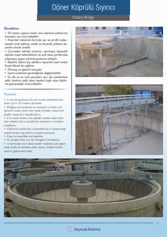 Se%u00e7mak Makina6Rotary BridgeD%u00f6ner K%u00f6pr%u00fcl%u00fc S%u0131y%u0131r%u0131c%u0131%u00d6zellikler%u2022%u200250 metre %u00e7ap%u0131na kadar t%u00fcm dairesel %u00e7%u00f6kt%u00fcrme havuzlar%u0131 i%u00e7in imal edilebilir.%u2022%u2002K%u00f6pr%u00fcler b%u00fck%u00fcml%u00fc formda sac ve profil malzemeden imal edilmi%u015f, statik ve dinamik y%u00fcklere dayan%u0131kl%u0131 olarak %u00fcretilir.%u2022%u2002%u00c7evreden tahrikli motora, a%u015f%u0131nmaya dayan%u0131kl%u0131 ulpolen kapl%u0131 tekerleklere ve a%u00e7%u0131k hava %u015fartlar%u0131nda %u00e7al%u0131%u015fmaya uygun y%u00fcr%u00fcme grubuna sahiptir.%u2022%u2002Elektrik iletimi d%u0131%u015f etkilere dayan%u0131kl%u0131 %u00f6zel imalat f%u0131r%u00e7al%u0131 bilezik ile sa%u011flan%u0131r. %u2022%u2002Montaj%u0131 ve i%u015fletimi kolayd%u0131r.%u2022%u2002S%u0131y%u0131r%u0131c%u0131 lastikleri gerekti%u011finde de%u011fi%u015ftirilebilir.%u2022%u2002Su alt%u0131 ve su %u00fcst%u00fc par%u00e7alar%u0131 ayr%u0131 ayr%u0131 paslanmaz %u00e7elik, karbon %u00e7elik %u00fczeri epoksi kapl%u0131 veya dald%u0131rma galvanizden imal edilebilir.Properties%u2022%u2002It can be produced for all circular sedimentation tanks up to 50 meters diameter.%u2022%u2002Bridges are produced as resistant to static and dynamic loads which are made of sheet metal and profile material in bended form.%u2022%u2002It is motor-driven, has ulpolen coated wear-resistant wheels and is suitable for operation in outdoor conditions.%u2022%u2002Electrical conduction is provided by a custom-engineered brush ring which is impact-resistant.%u2022%u2002Easy to assemble and operate.%u2022%u2002Its scraper tires can be changed if necessary.%u2022%u2002Underwater and above-water materials are seperately made of stainless-steel, epoxy coated carbon steel or galvanized steel.